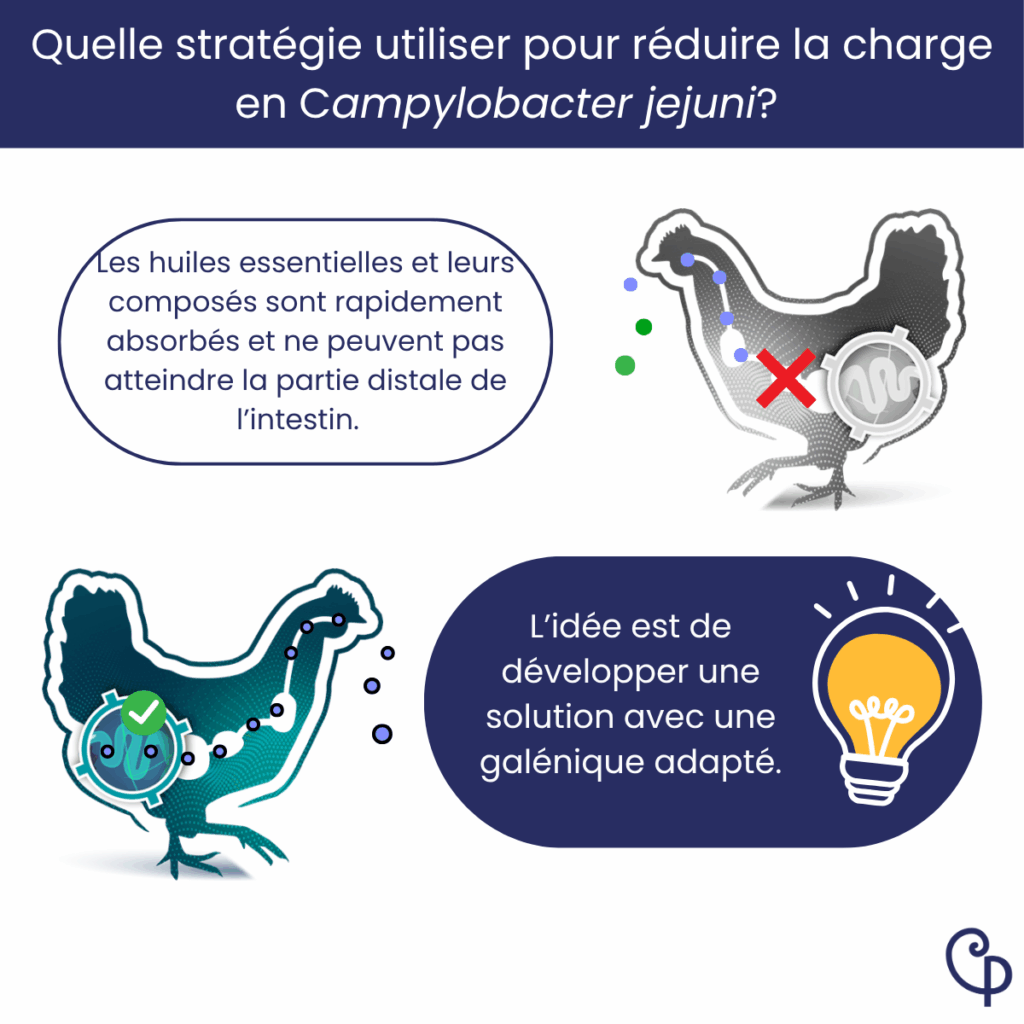 Ces points sont problématiques puisque, chez le poulet, cette bactérie est principalement retrouvée dans la partie distale de l’intestin, au niveau de deux poches appelées caeca. Il faut donc que la molécule active arrive jusqu’aux caeca pour étudier son efficacité antibactérienne in vivo.