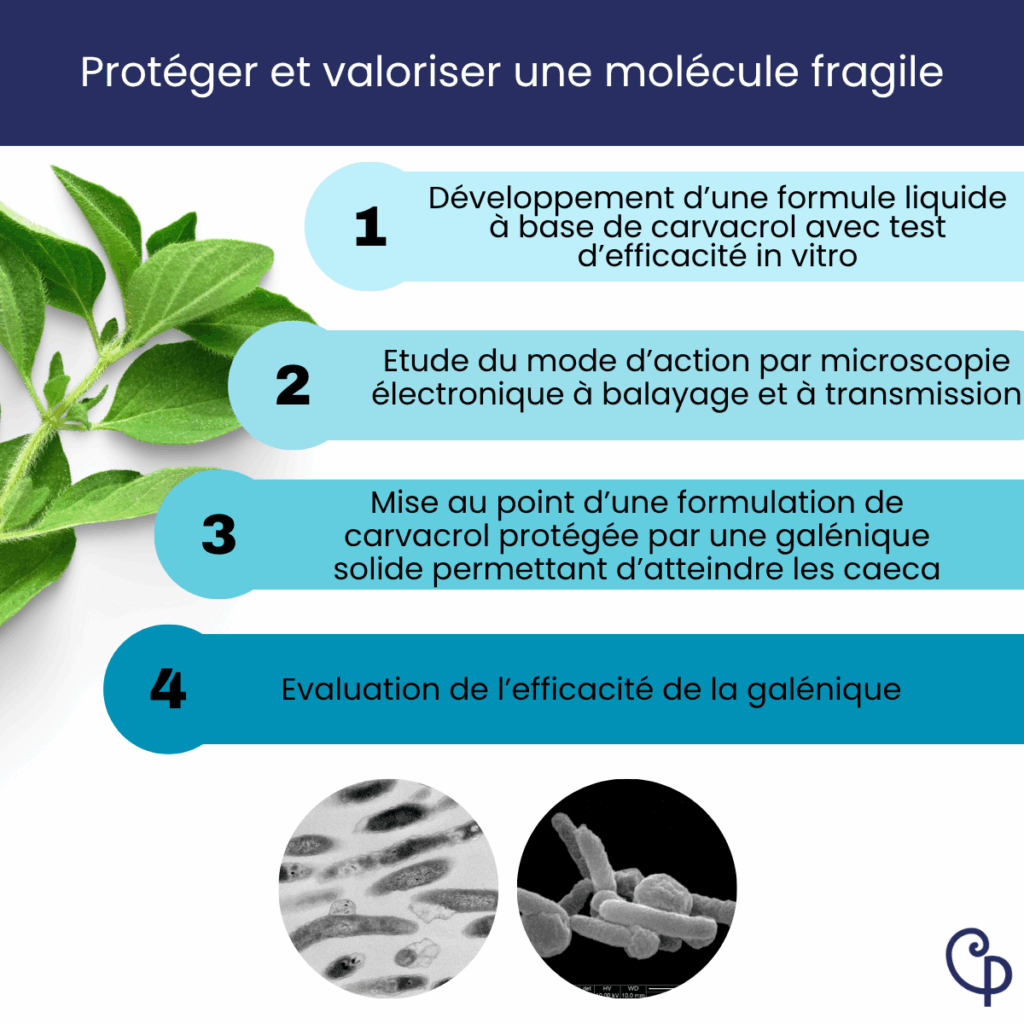 Nos équipes ont développé des solutions de formulation permettant de protéger le carvacrol, de contrôler sa libération et d’optimiser son efficacité face à des pathogènes spécifiques comme Campylobacter.