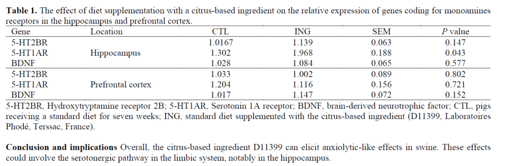 The most significant finding was a marked increase in the expression of the gene encoding the 5-HT1A receptor (Serotonin 1A receptor) in the hippocampus of pigs receiving the sensory ingredient (ING) compared with control animals (CTL) (Table 1; P < 0.05).