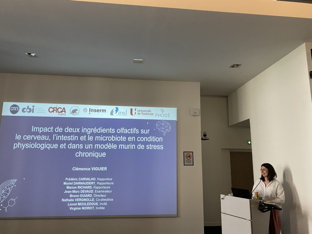 Intitulé “The impact of two olfactory ingredients on the brain, the gut, and the microbiota under physiological conditions and in a murine model of chronic stress”, le travail de Clémence s’inscrit dans la continuité des recherches menées, mais ouvre également un nouveau champ. Alors que la plupart des études scientifiques portent sur le lien ascendant microbiote–cerveau (exemples des probiotiques et prébiotiques), sa thèse s’est intéressée à la communication par voie descendante, du cerveau vers le microbiote via l’olfaction.